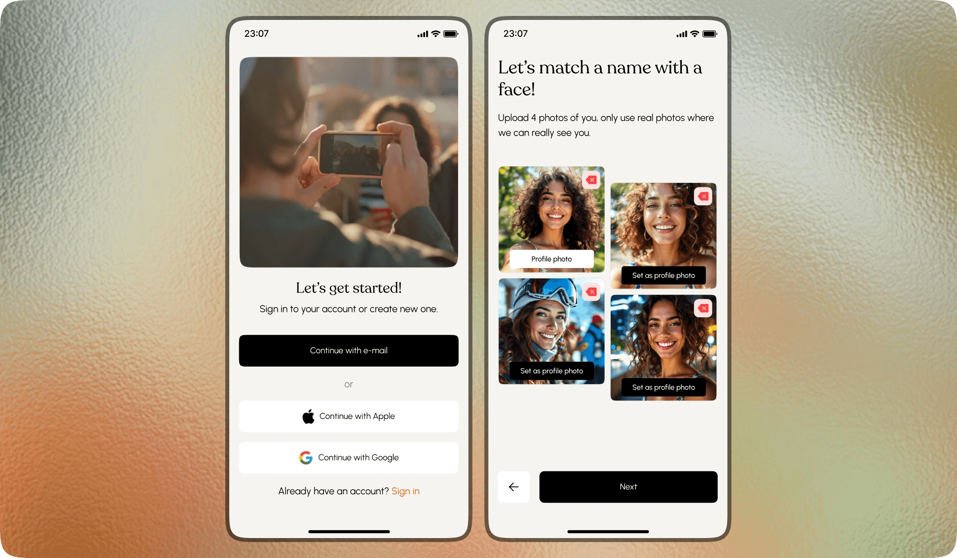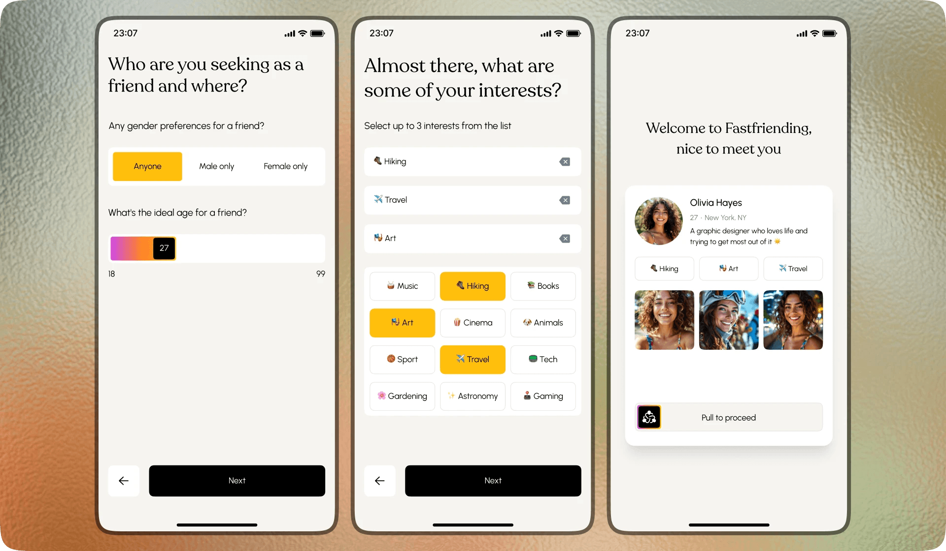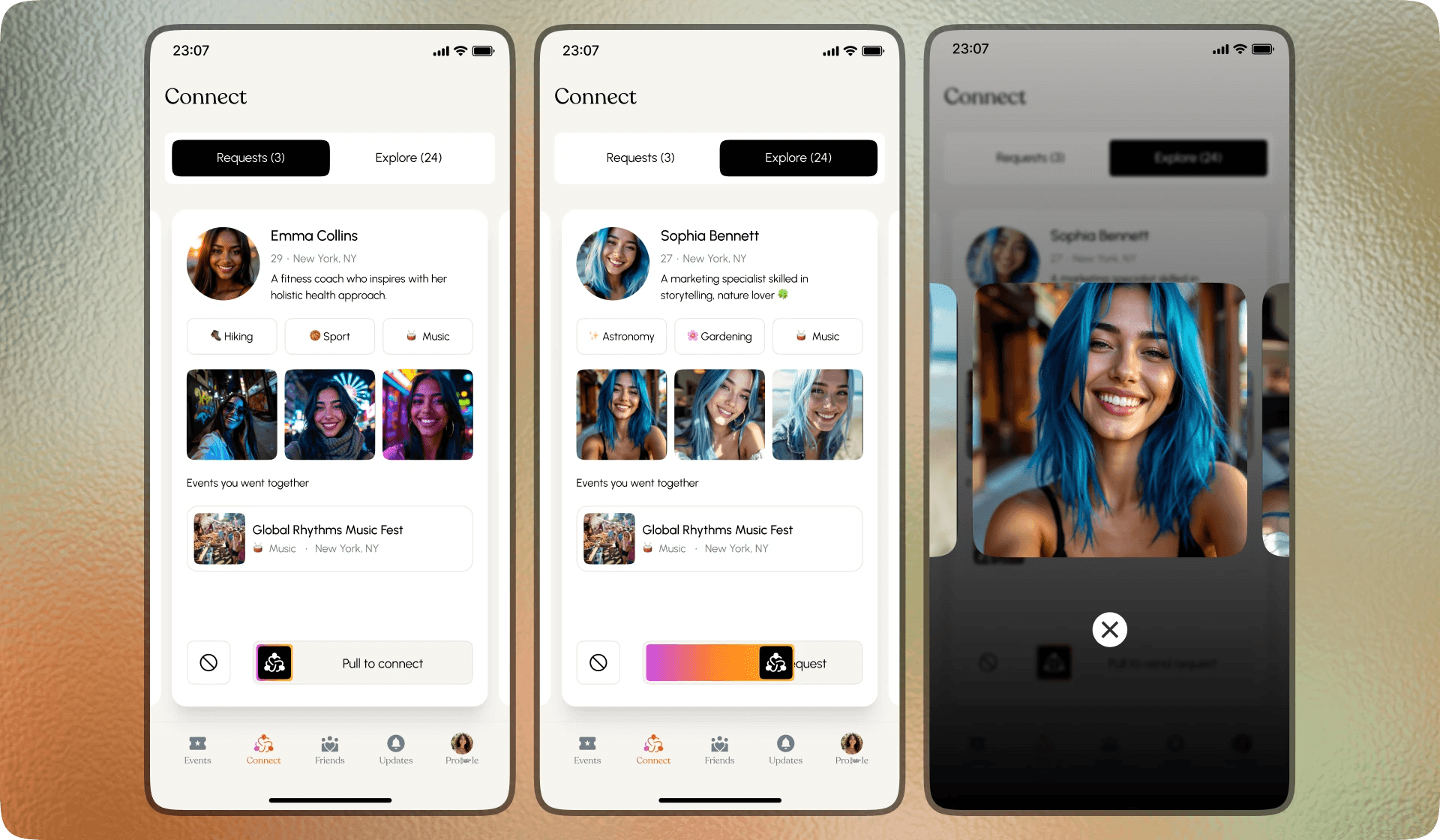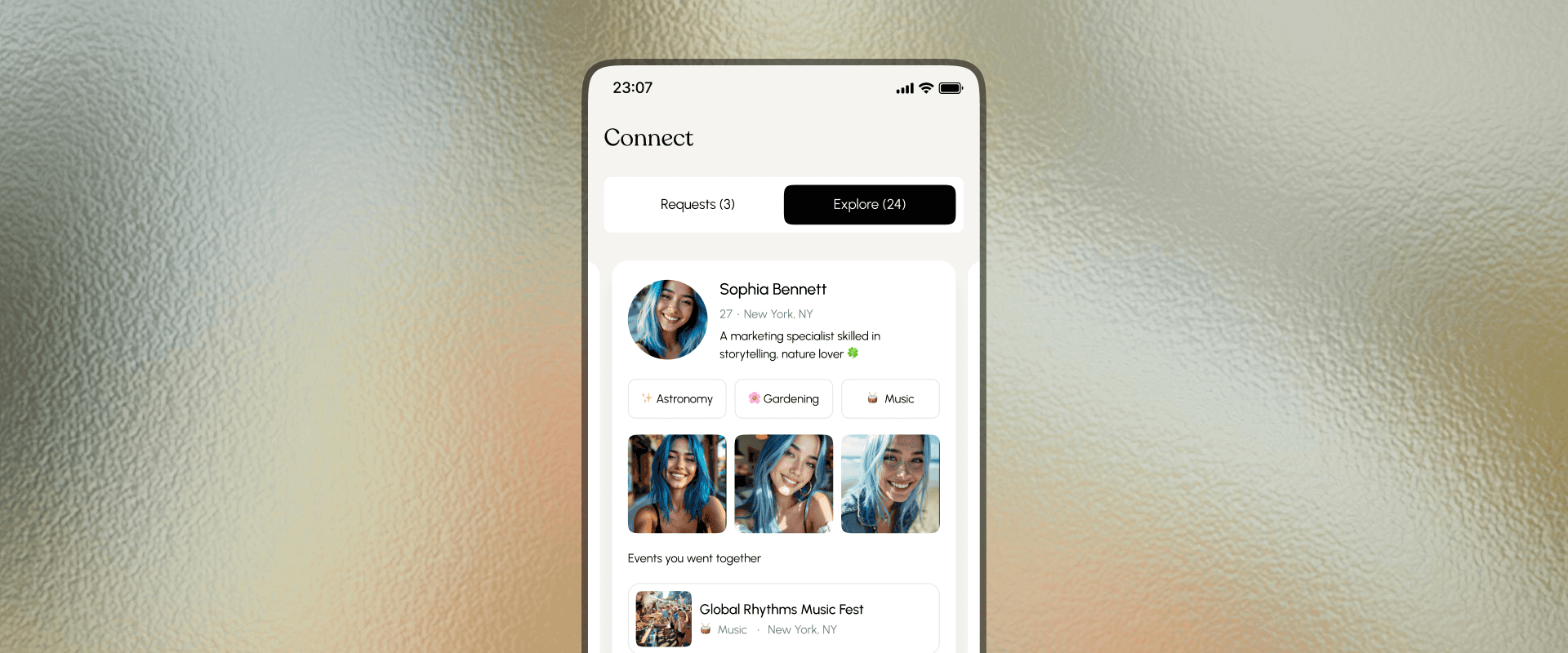 A friend match-making app with a unique premise: connect people who attend the same events. The concept was solid, but the execution wasn't delivering. Users struggled through sign-up, the ticketing process created friction, and once people attended events, there was no way to nurture those connections. Event attendance was stagnant and engagement was declining.